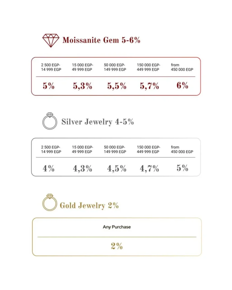 Gold, silver, and moissanite are standardized categories, which makes the program transparent.